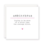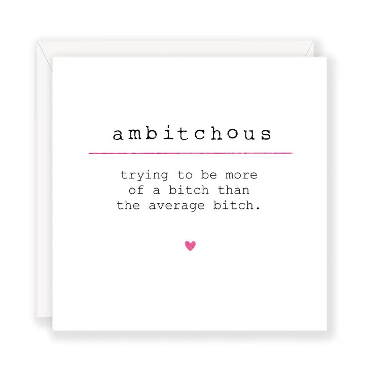 Simple and sweet (and a little bit sour) ;). Ambitchous- trying to be more of a bitch than the average bitch. This greeting card is printed on 100% cotton paper, comes with a matching envelope and is protected in a cello sleeve.