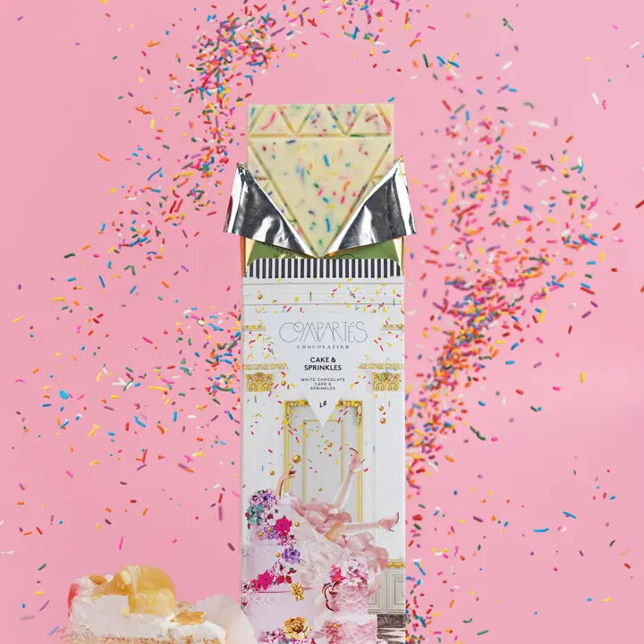 Compartés Chocolatier Birthday Cake and sprinkles gourmet white chocolate bar makes any celebration sweeter. This festive, luxury chocolate bar is made with three types of vanilla beans, moist & delicious fresh white birthday cake mix, and tons of colorful sprinkles! So good, you won't be able to get enough!
