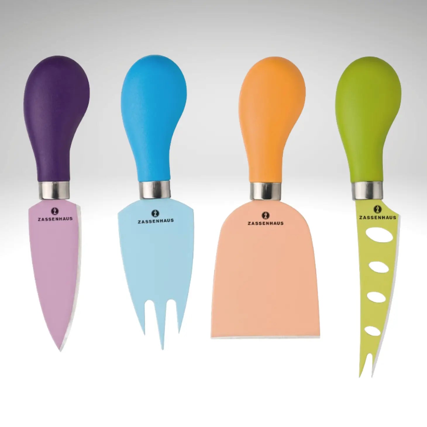 This set of four knives is made of high-grade stainless steel and features a non-stick color coating. The tough non-stick coating ensures that the blade cuts through food with little effort, resulting in even slices. The set includes a soft cheese knife measuring 14 cm, a hard cheese knife measuring 12.5 cm, a serving fork measuring 12.5 cm, and a Parmesan cheese knife measuring 13 cm. Whether you're serving cheese at a party or preparing a meal at home, these knives are sure to impress with their sleek design and efficient cutting capabilities.