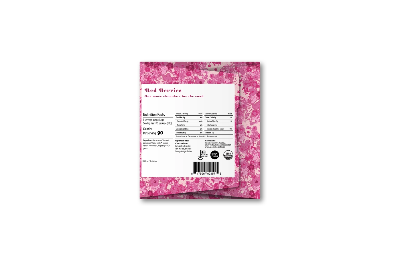 Ingredients: Cacao beans*, Coconut palm sugar*, Cacao butter*, Coconut flakes*, Strawberry*, Raspberry*. (*Organic). May contain traces of nuts (cashew).