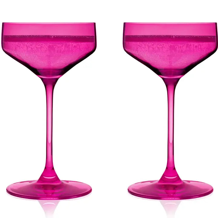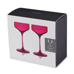 Crafted from European crystal with a gorgeous berry pink hue, these coupe glasses bring a vibrant fuchsia glow to shaken cocktails. Add some color to your glassware collection with these stemmed cocktail glasses.