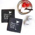 Sold Individually. A great gift for your favorite golfer. Made locally by Cheers, Inc. from natural USA slate. They are hand-stamped with permanent ink and free of sealants. Leveled with cork feet on the bottom to protect surfaces and keep drinks stable.