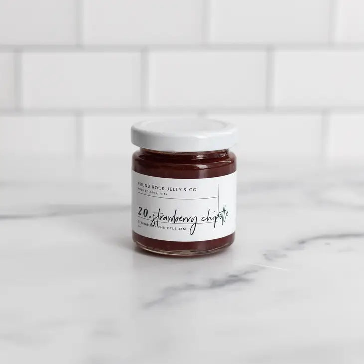 This Strawberry Chipotle Jam is one of the most versatile jams at Round Rock Jelly & Co. Chipotle peppers spice up this organic strawberry jam, which is fabulous on chicken, cornbread, pork or as part of a cheese appetizer. It has a smoky and sweet balanced taste to it.Shelf life: 12–24 months.