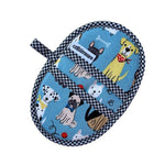 A variety of dogs are placed on a blue background with gray lining and black houndstooth trim. Pattern placement may vary. There are quite a few different dogs so each mitt will be different.