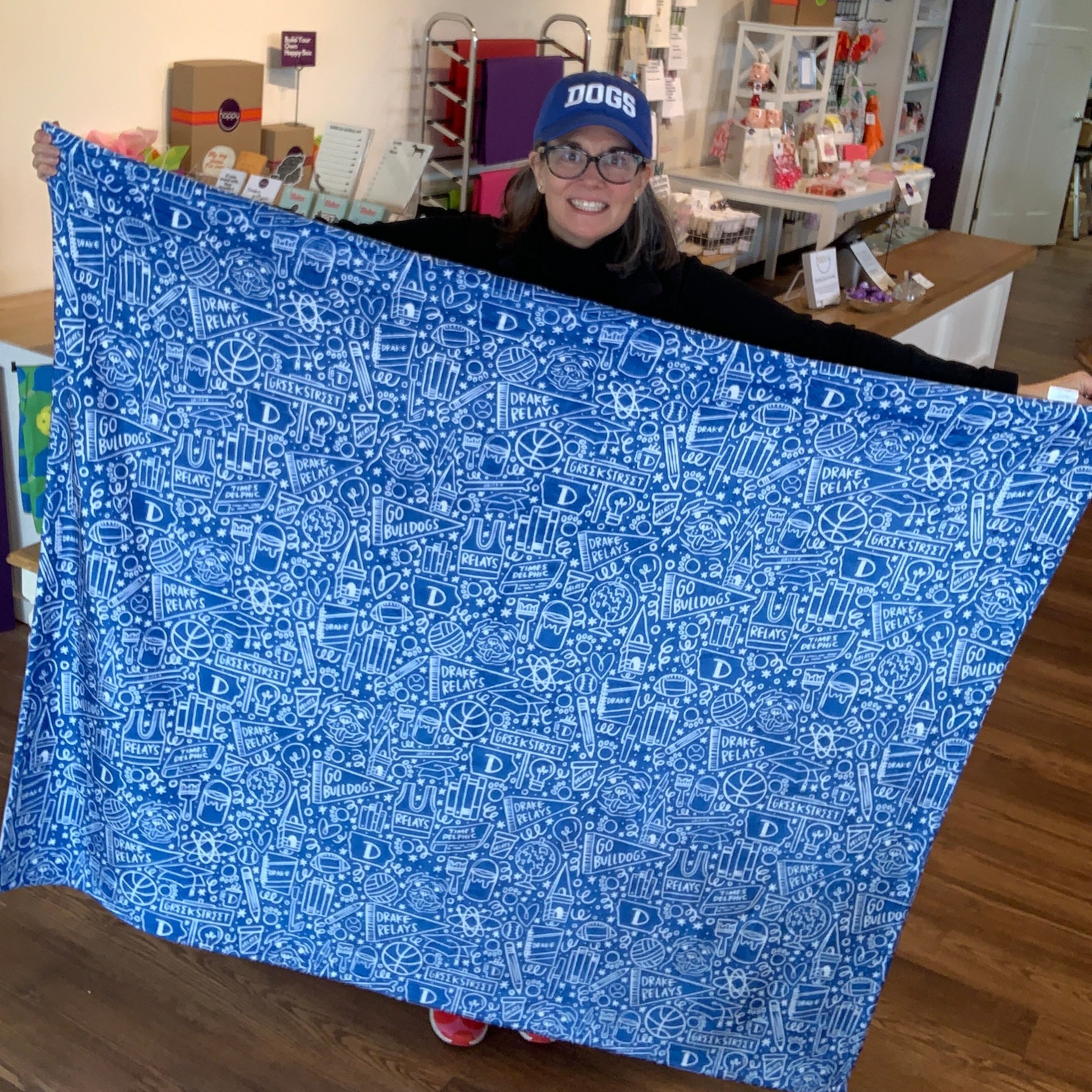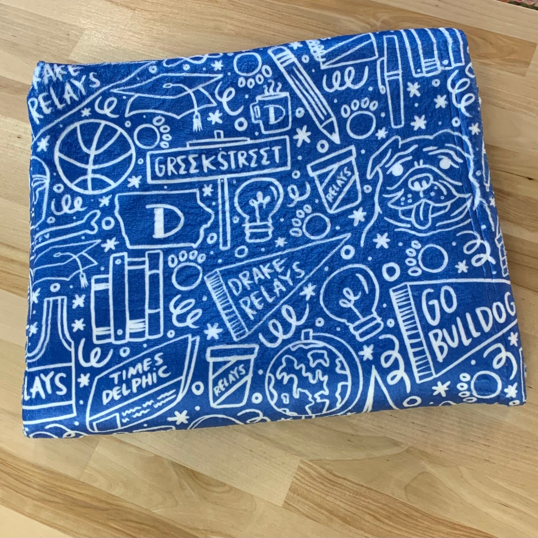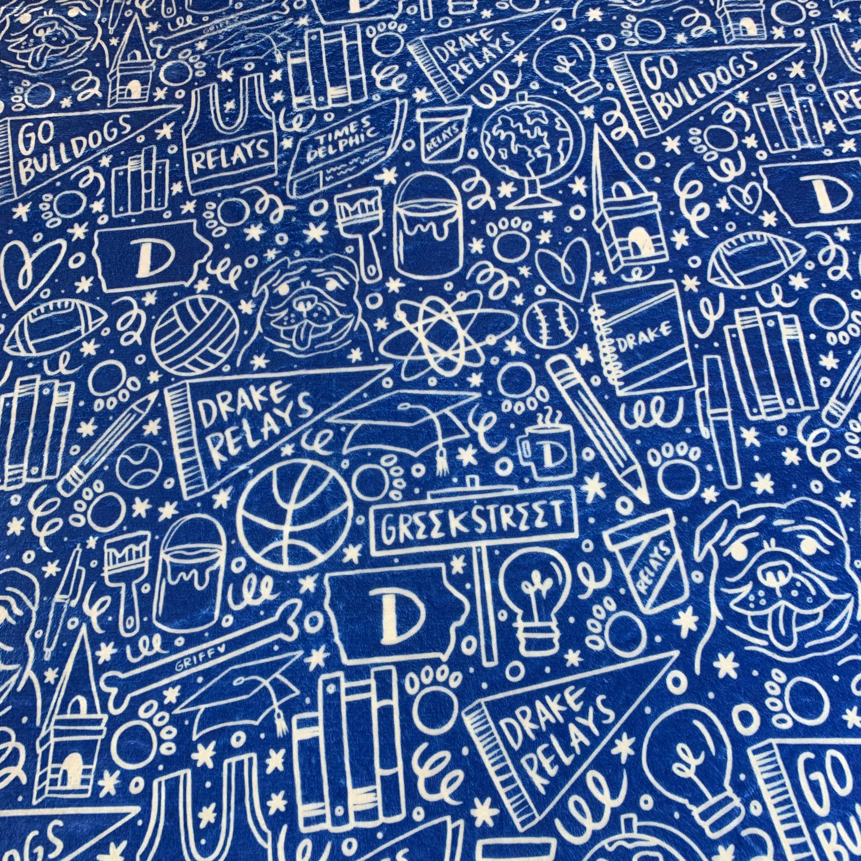 Your student can show their Drake pride and school spirit with this custom blanket created by Happy DSM. This is a special collaboration with local artist Laura Palmer, XO-LP. The one of a kind artwork features a whimsical design of nostalgic Drake icons.
