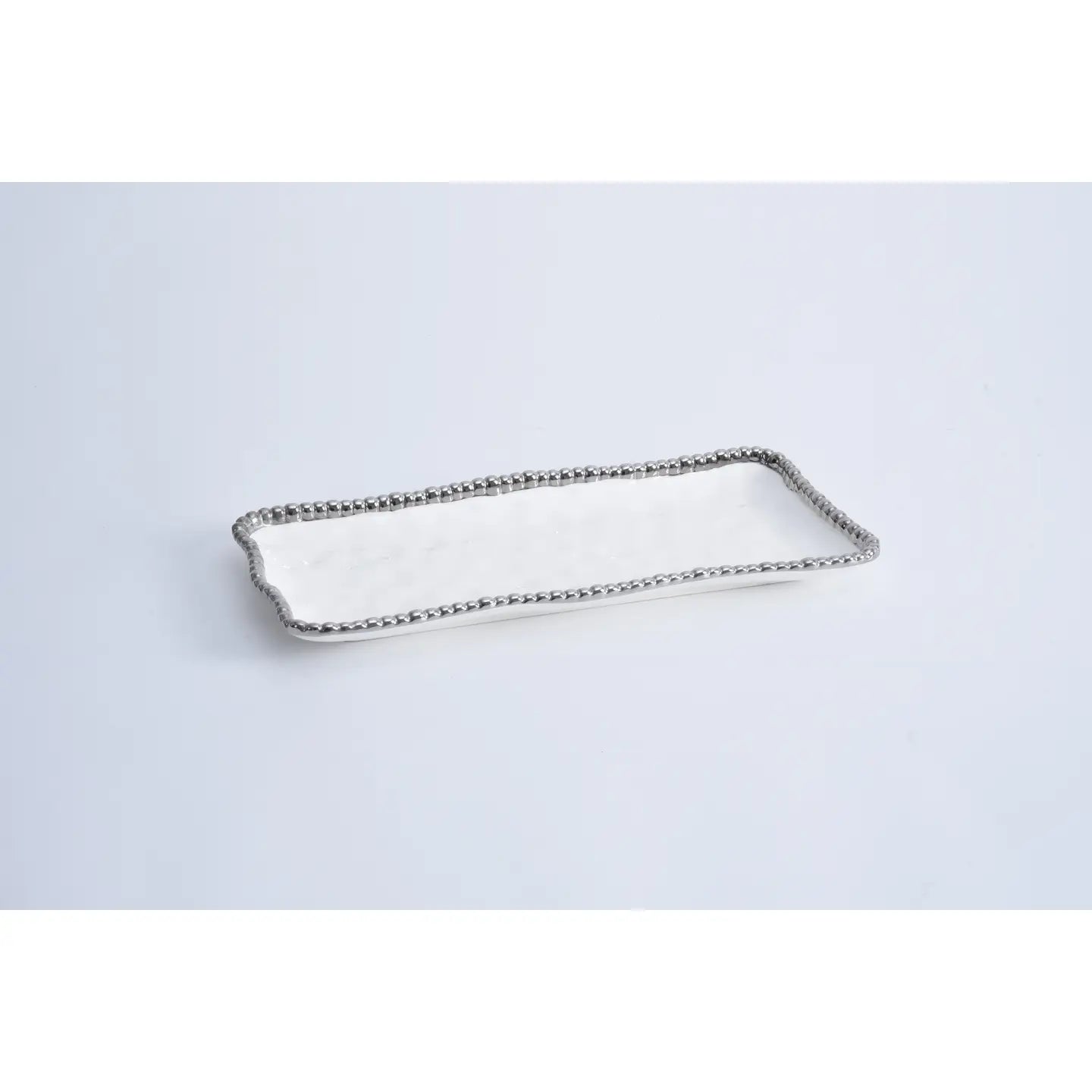 This 10" x 5" tray is ideal for serving up your favorite appetizer. You can even keep things warm in the oven right on the platter. Striking and elegant white porcelain with silver beads in titanium.  Food safe. Dishwasher safe. Oven safe to 500°.