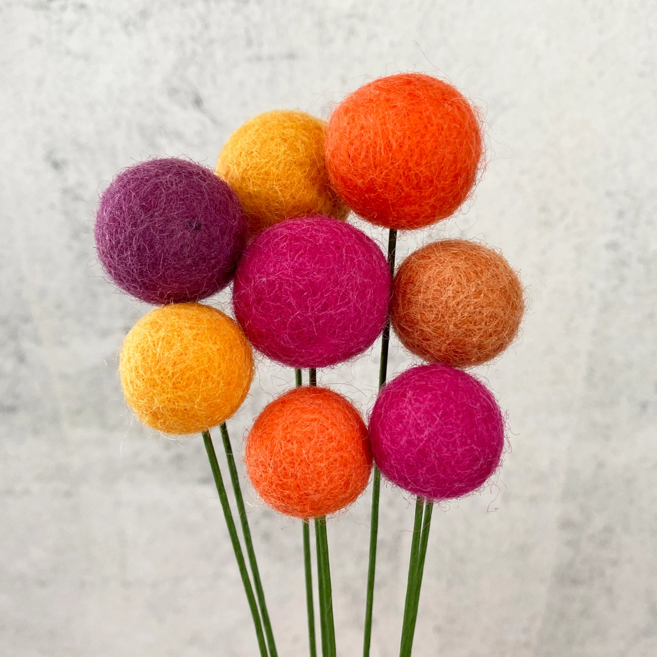 Each felt ball measures 2-3cm in size, with varying size balls within the bundle. The stems are made from green cloth covered floral wire and measure 16" in height. The floral wire can easily be cut with wire cutters in order to arrange the felt balls at varying heights. These felted wool flower ball bouquets are sold as a set of 8 and are bundled together to be sold as a single bouquet.