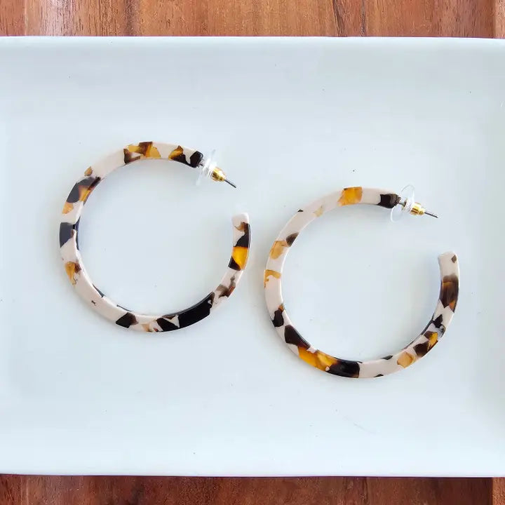 * Hypoallergenic stainless steel * Lightweight and durable plant-based acetate acrylic * 2" diameter * Each pair will vary in coloring, making them perfectly unique