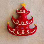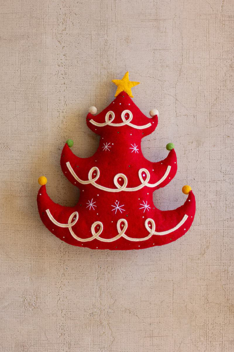 This red felt Christmas tree pillow will add a pop of festive magic to your space.  It has a yellow topper and icing stripes with lights on branches.