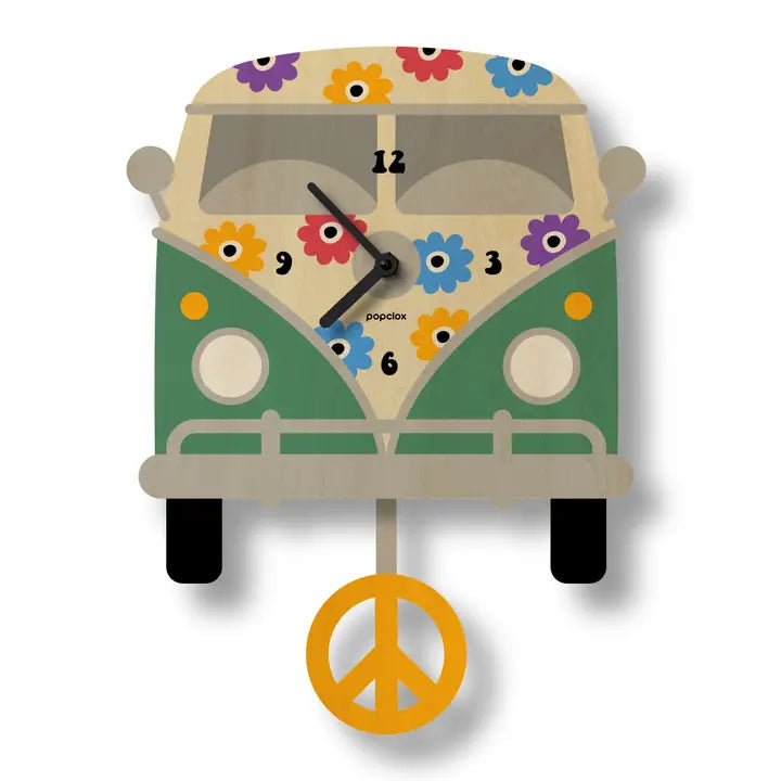Experience the perfect blend of hippie vibes and functionality with our peace bus wall clock. Featuring a trippy camper bus design and a swinging peace sign pendulum, this clock is sure to add a fun and groovy touch to any room. Perfect for those who appreciate nostalgic and whimsical decor.