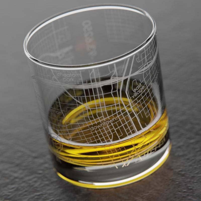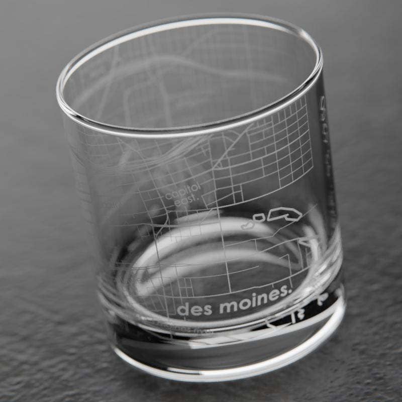 This barware is precision-etched entirely around the vessel with a beautifully detailed map of Des Moines. As you sip your cocktail, you'll recognize some familiar streets and neighborhoods.