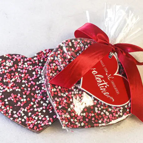A 4-ounce solid milk chocolate heart topped in red, pink and white heart-shaped nonpareils. Packaged in a clear cellophane bag with a red ribbon & a heart-shaped "Valentine" hang tag.