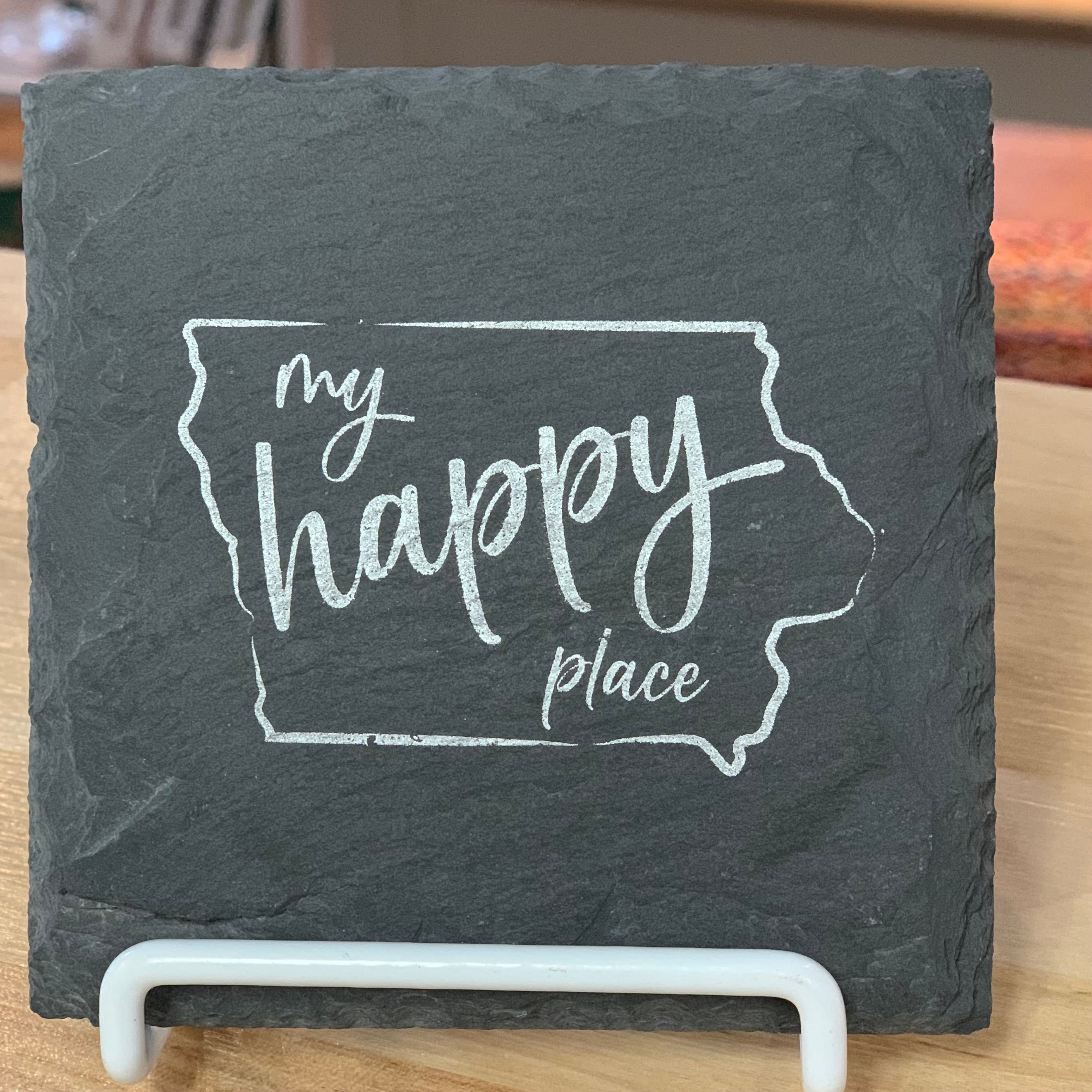 Display your Iowa pride with these coasters. Made locally by Cheers, Ink. from natural USA slate. They are hand-stamped with permanent ink and free of sealants. Leveled with cork feet on the bottom to protect surfaces and keep drinks stable.